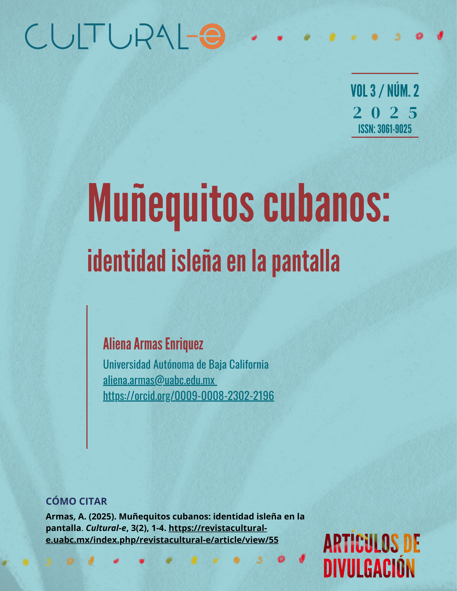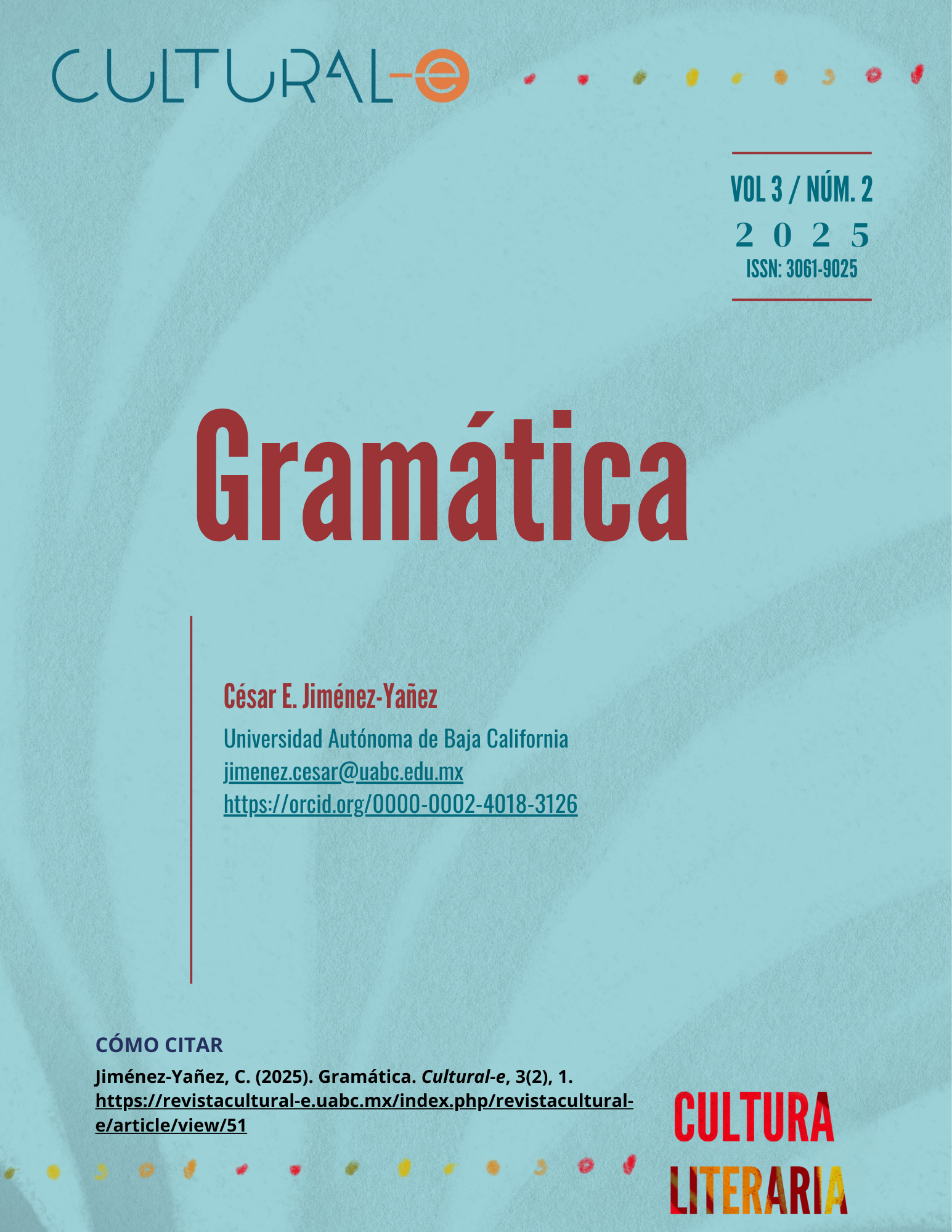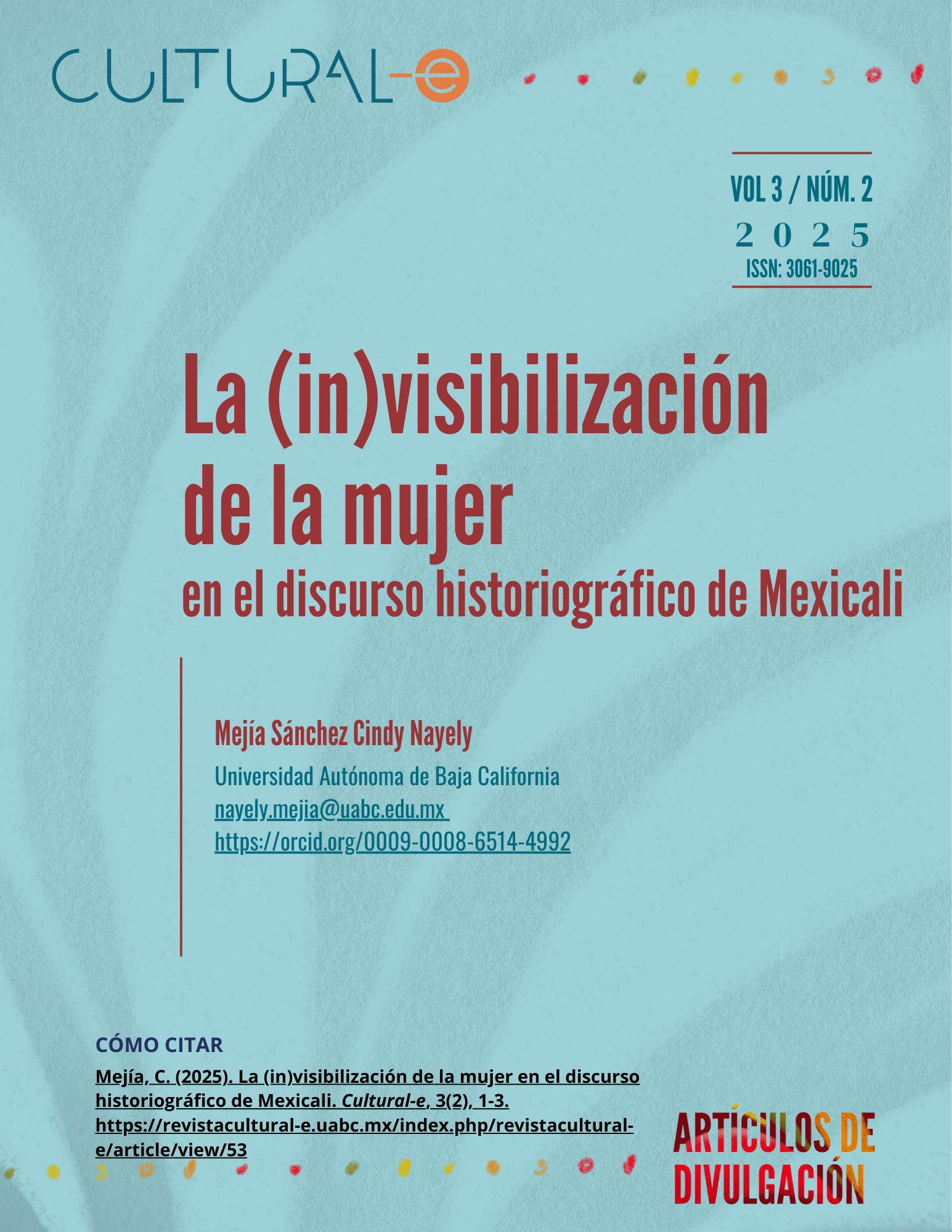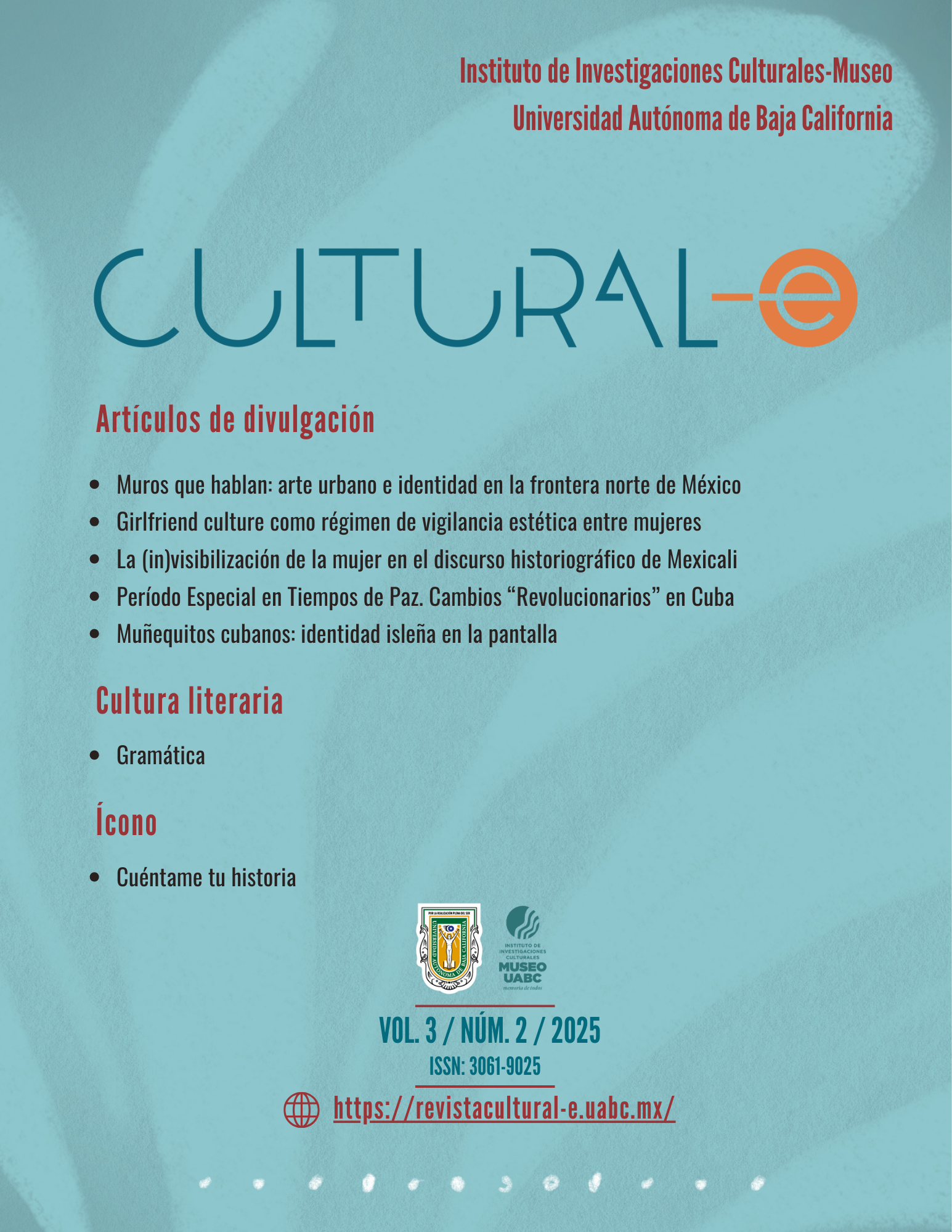 Cultural-e, vol. 3, núm. 2, julio-diciembre 2025, es una publicación semestral editada por la Universidad Autónoma de Baja California a través del Instituto de Investigaciones Culturales-Museo, ubicado en Av. Reforma y calle L sin número, Colonia Nueva, Mexicali, Baja California, C.P. 21100, teléfonos: (52) 686 554-1977 y 686 552-5715, https://revistacultural-e.uabc.mx, cultural-e@uabc.edu.mx Editora responsable: Zicri Colmenares Díaz. Reserva de Derechos al Uso Exclusivo N° 04-2023-060909164400-102 e ISSN electrónico 3061-9025, ambos otorgados por el Instituto Nacional del Derecho de Autor. Responsable de la actualización del último número, César E. Jiménez Yañez. Av. Reforma y calle L sin número, Colonia Nueva, Mexicali, Baja California, CP 21100. Última actualización 29 diciembre 2025.