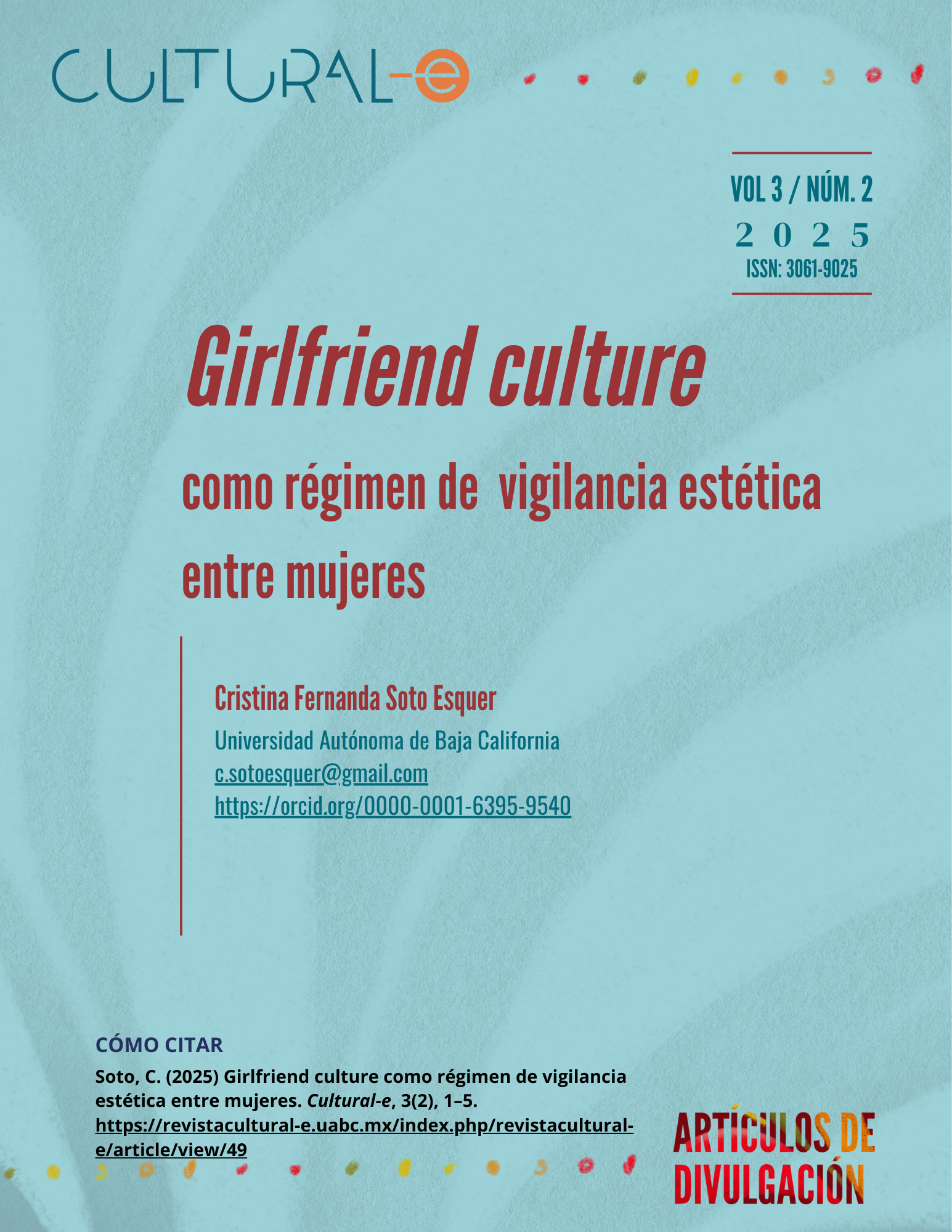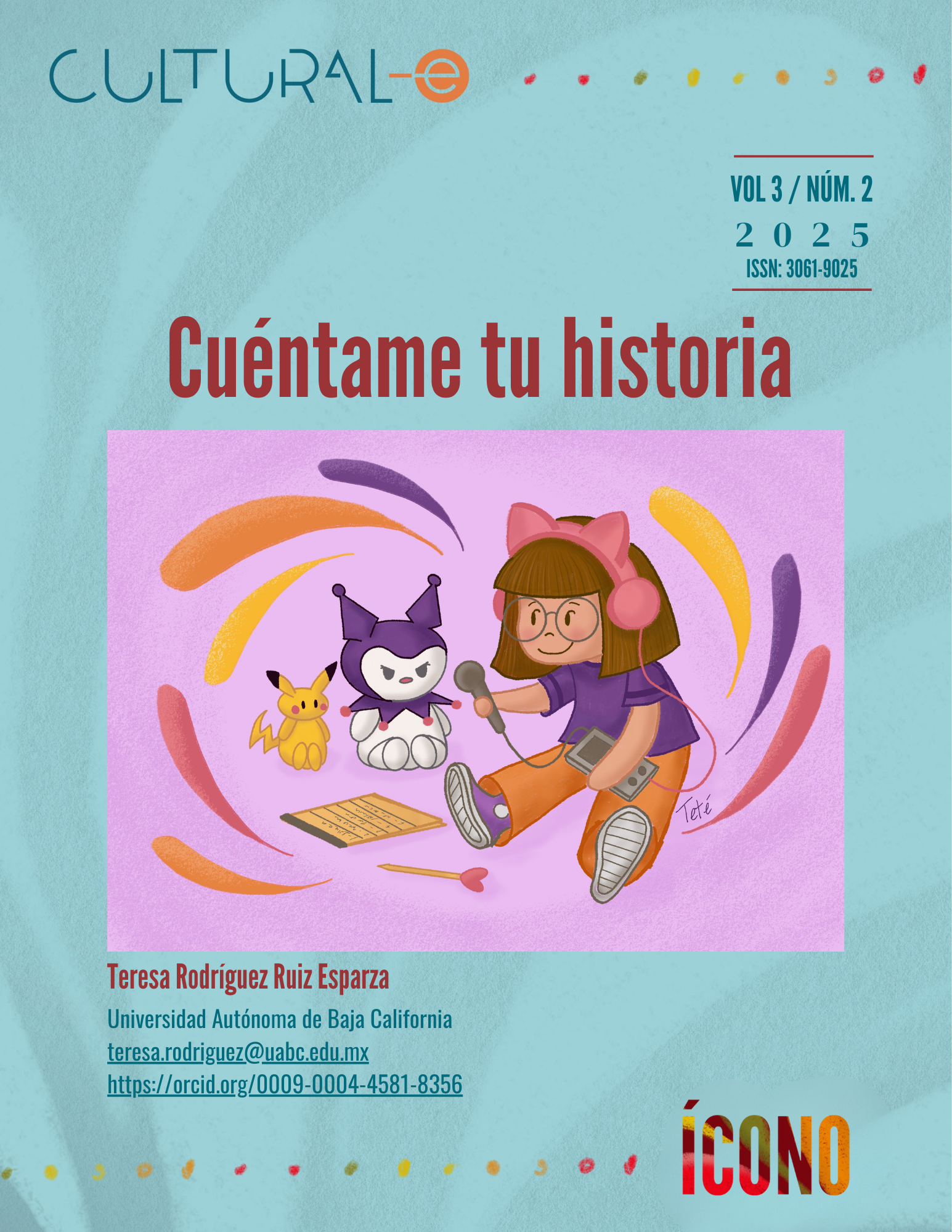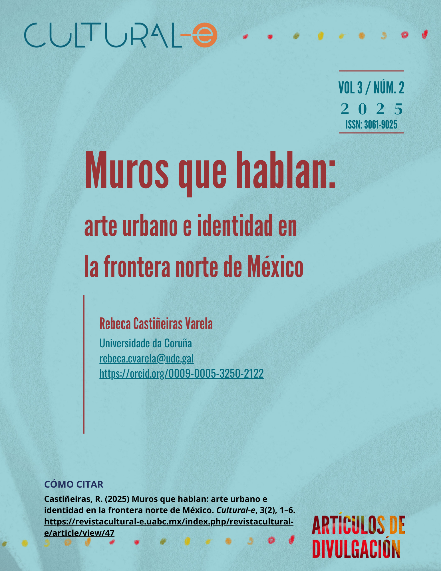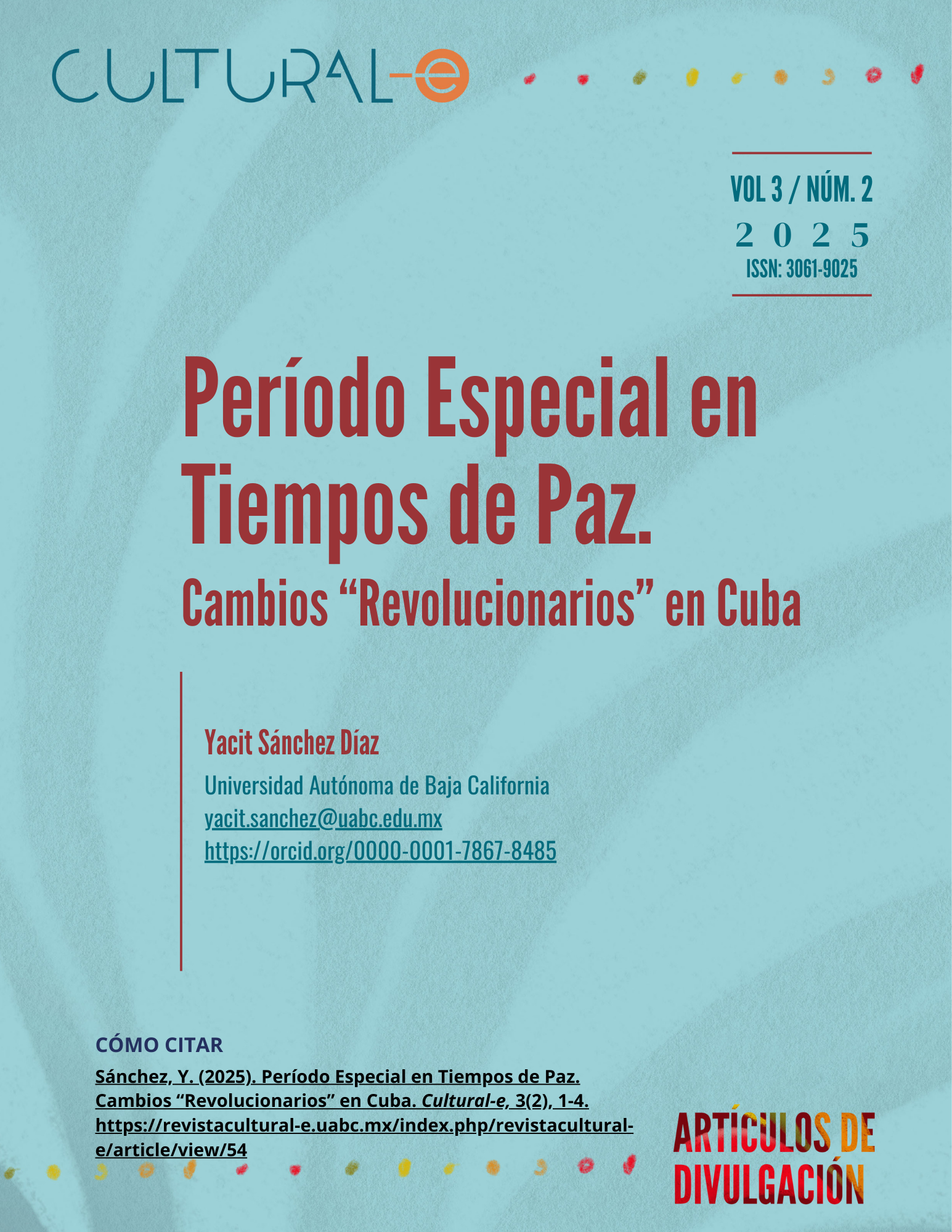 Cultural-e, vol. 3, núm. 2, julio-diciembre 2025, es una publicación semestral editada por la Universidad Autónoma de Baja California a través del Instituto de Investigaciones Culturales-Museo, ubicado en Av. Reforma y calle L sin número, Colonia Nueva, Mexicali, Baja California, C.P. 21100, teléfonos: (52) 686 554-1977 y 686 552-5715, https://revistacultural-e.uabc.mx, cultural-e@uabc.edu.mx Editora responsable: Zicri Colmenares Díaz. Reserva de Derechos al Uso Exclusivo N° 04-2023-060909164400-102 e ISSN electrónico 3061-9025, ambos otorgados por el Instituto Nacional del Derecho de Autor. Responsable de la actualización del último número, César E. Jiménez Yañez. Av. Reforma y calle L sin número, Colonia Nueva, Mexicali, Baja California, CP 21100. Última actualización 29 diciembre 2025.