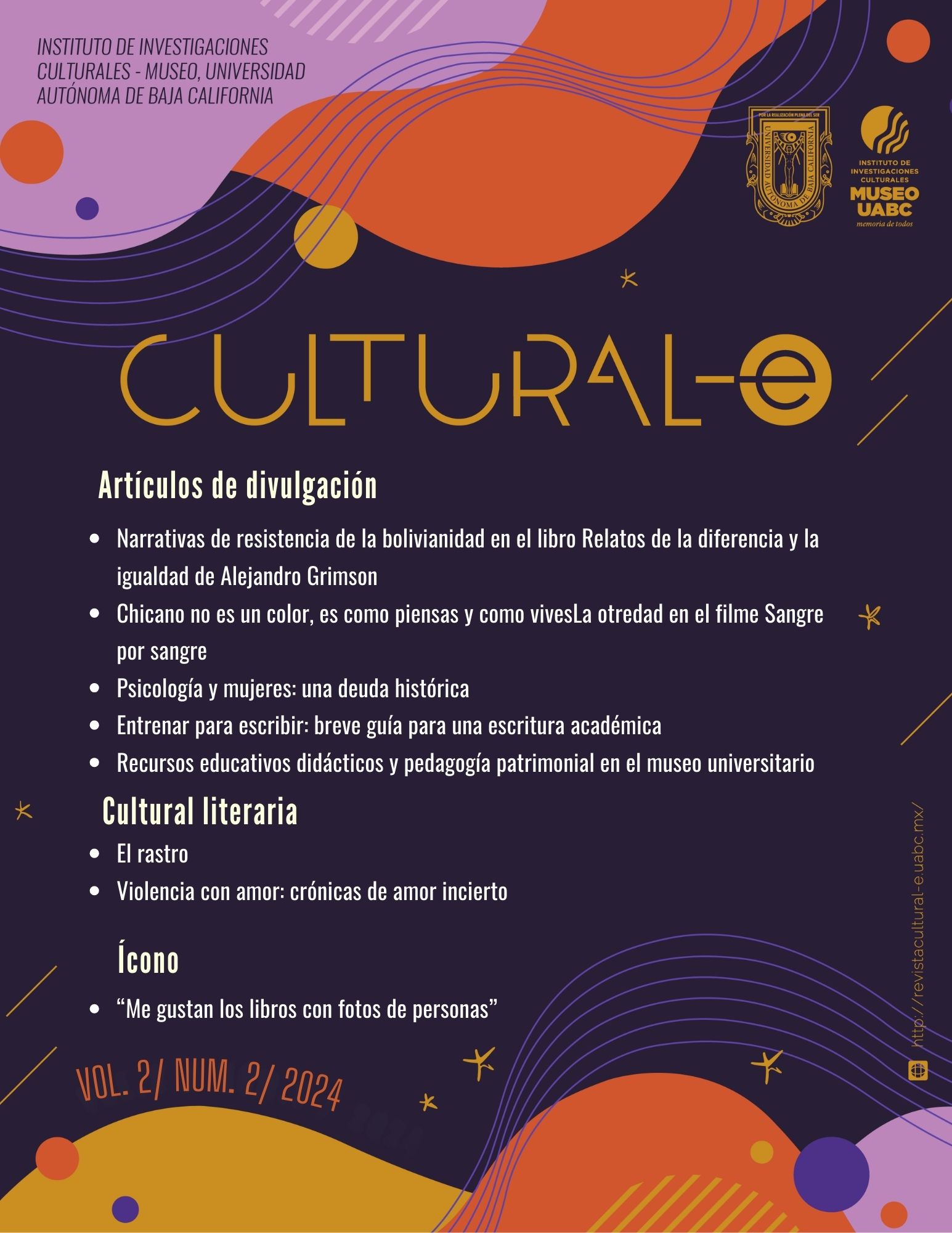 Vol. 2 Núm. 2 (2024)Cultural-e, vol. 2, núm. 2, julio-diciembre 2024, es una publicación semestral editada por la Universidad Autónoma de Baja California a través del Instituto de Investigaciones Culturales-Museo, ubicado en Av. Reforma y calle L sin número, Colonia Nueva, Mexicali, Baja California, C.P. 21100, teléfonos: (52) 686 554-1977 y 686 552-5715, https://revistacultural-e.uabc.mx, cultural-e@uabc.edu.mx Editora responsable: Zicri Colmenares Díaz. Reserva de Derechos al Uso Exclusivo N° 04-2023-060909164400-102 e ISSN electrónico 3061-9025, ambos otorgados por el Instituto Nacional del Derecho de Autor. Responsable de la actualización del último número, César E. Jiménez Yañez. Av. Reforma y calle L sin número, Colonia Nueva, Mexicali, Baja California, CP 21100. Última actualización 23 diciembre 2024
